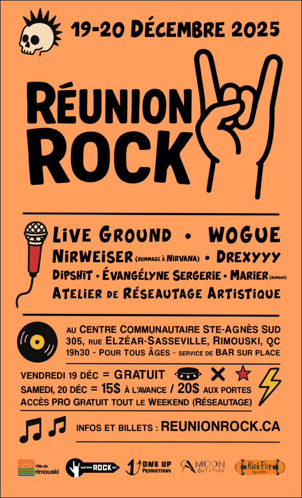 Le Festival Réunion Rock, lancé en 2025 à Rimouski, met de l’avant la scène rock locale et les artistes émergents de l’Est-du-Québec. En proposant des spectacles ancrés dans la créativité régionale, le festival vise à dynamiser l’offre culturelle et à offrir une plateforme essentielle aux musiciens d’ici.